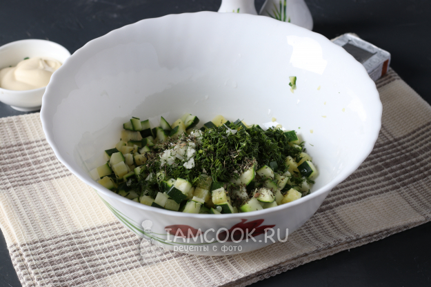 Измельчить укроп и чеснок. Сложить кабачки в глубокую миску и добавить к ним соль, прованские травы, укроп и чеснок.
