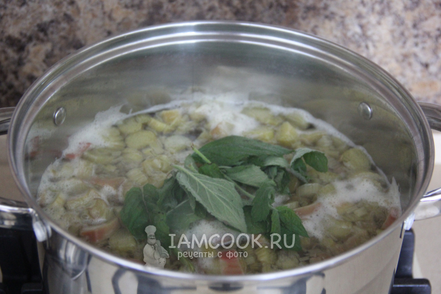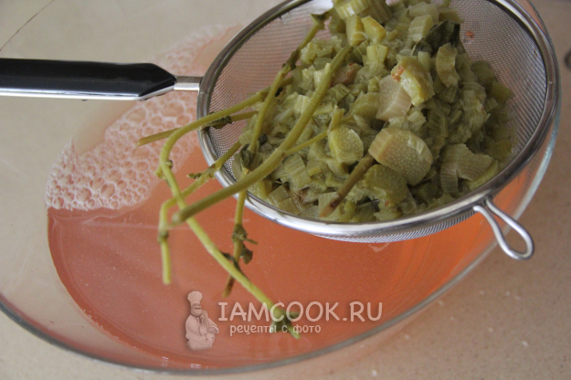 Затем процедить квас. Жмых от ревеня и мяты выкинуть.