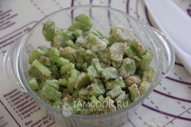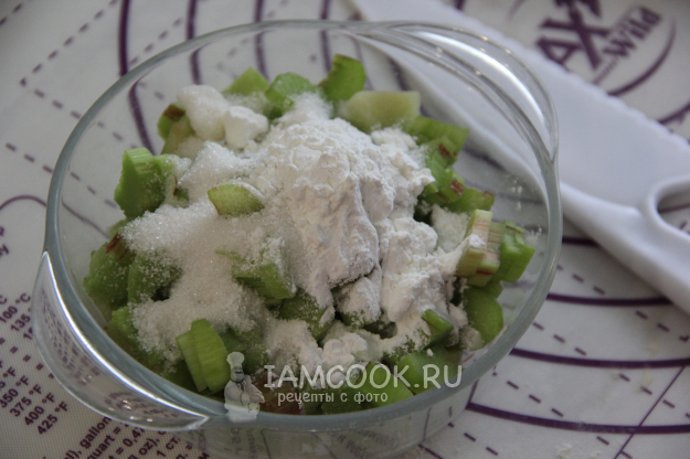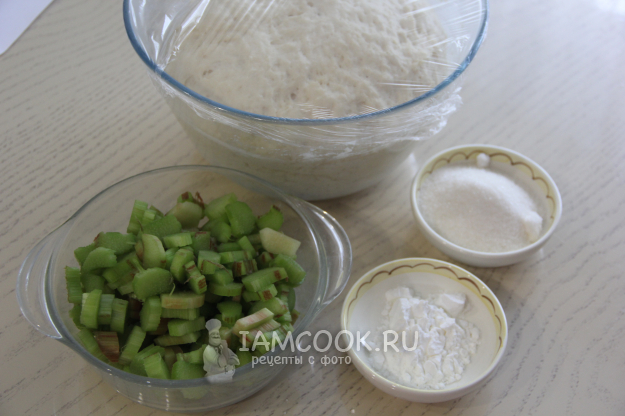 Перемешать тесто сначала ложкой, а затем хорошо вымесить руками. Оставить тесто в миске на 1,5 часа в теплом месте, миску лучше накрыть пищевой пленкой. Для начинки ревень намыть и снять тонкую пленку по всей длине стебля. Нарезать ревень на кусочки.