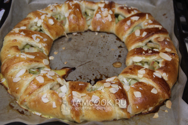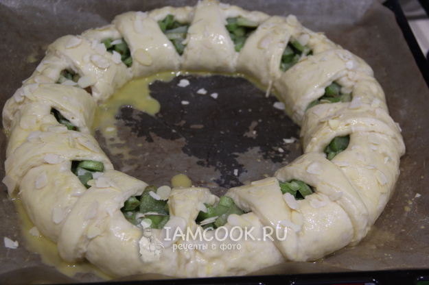 Затем лучики завернуть поверх начинки и теста и завести под низ пирога. Оставить пирог на противне на 35 минут.