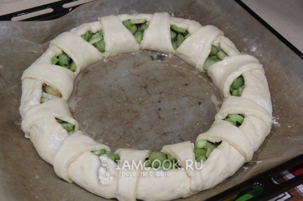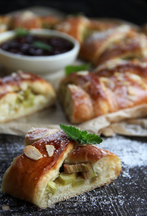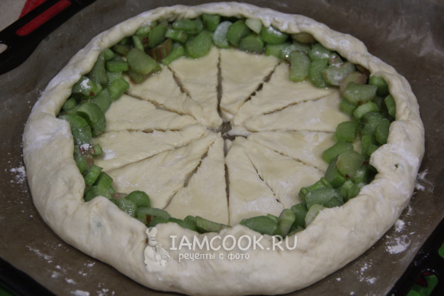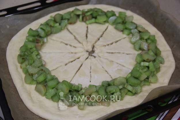 Выпекать пирог из дрожжевого теста с ревенем в разогретой духовке при 200 градусах примерно 30 минут, до золотистого цвета.