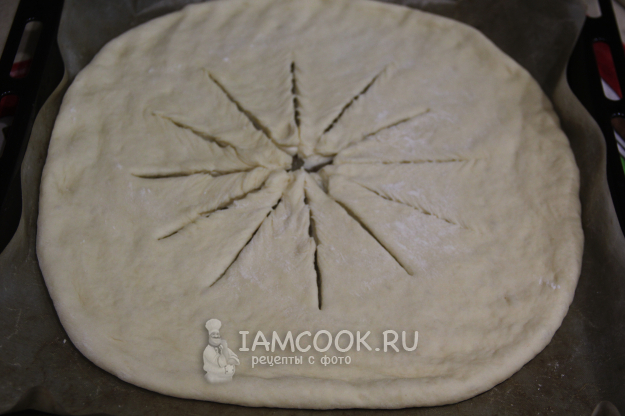 Противень застелить пергаментом и выложить тесто. Сделать в середине круга разрезы в виде 12 лучей.