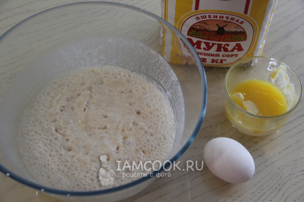 Добавить в опару яйцо, соль и масло. Перемешать и всыпать муку.