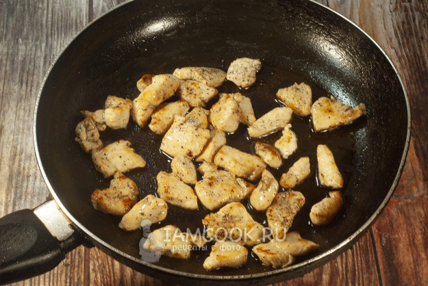 Посолим кусочки филе, поперчим, поджарим на растительном масле (используем половину масла).