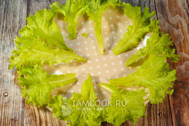 Листья салата вымоем с двух сторон, обсушим. Выложим на блюдо.