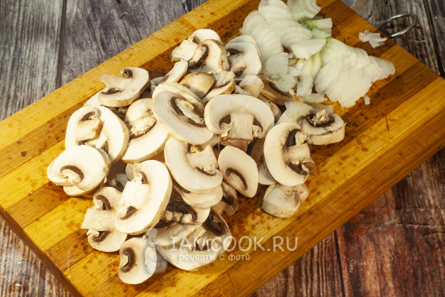 Шампиньоны промоем, нарежем пластинками, лук нарежем тонко.