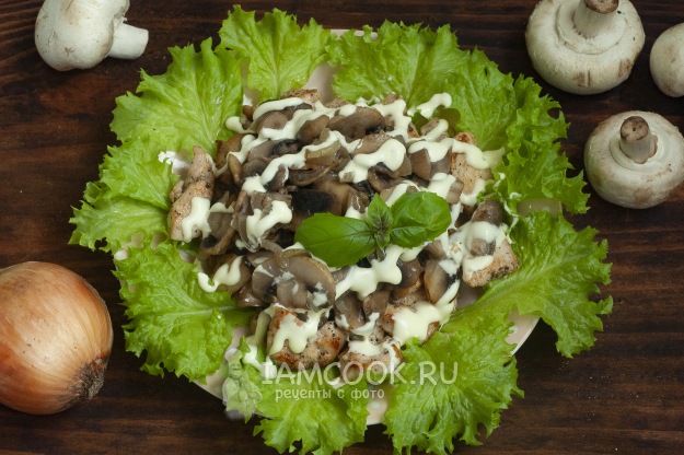 Филе и грибы перемешаем, выложим на листья. Нанесем сетку майонезом.