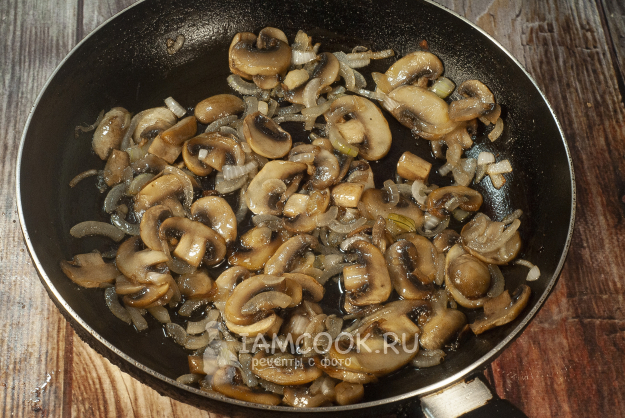 Выложим грибы и лук на сковороду с подсолнечным маслом (используем оставшееся масло). Чуть присолим и поджарим.