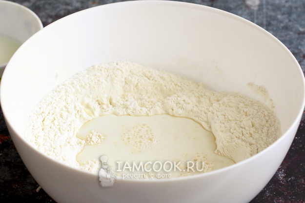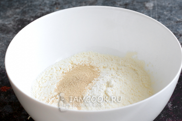 Сухие дрожжи соедините с мукой и солью. Обращайте внимание на способ смешивания дрожжей, ведь некоторые виды нужно смешивать с жидкостями.