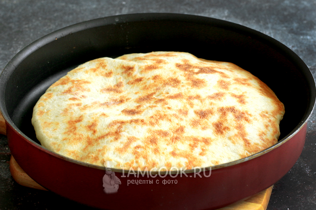 Обжарьте лепешку на сухой сковороде под крышкой с обеих сторон. При жарке лепешка может вздуваться, проткните ее по центру ножом.