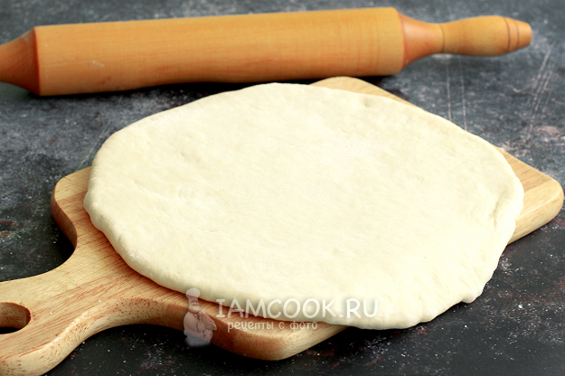 Аккуратно приплюсните шар и раскатайте в лепешку толщиной 8 мм. Немного припыляйте тесто мукой по надобности.