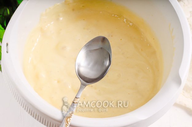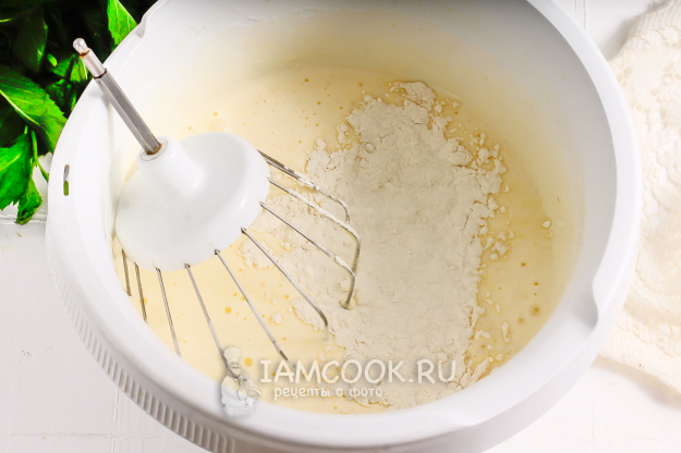 Взбейте яйца в течение 3-5 минут в пышную пену. Масса должна побелеть и увеличиться в два-три раза. Всыпьте просеянную пшеничную муку и аккуратно вмешайте ее венчиком или силиконовой лопаткой, стараясь не выпустить пузырьки воздуха.