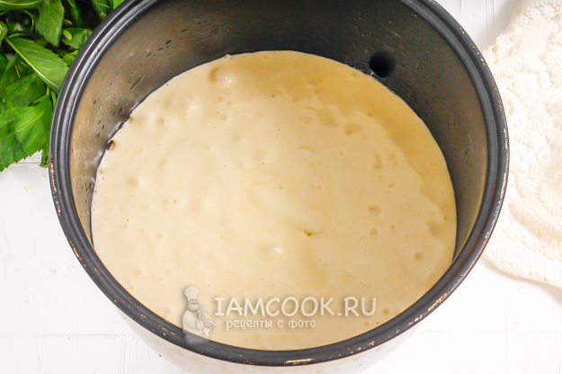 Смажьте форму оставшимся растительным маслом и перелейте в нее тесто. Разровняйте поверхность теста силиконовой лопаткой. Мне удобно выпекать бисквиты в форме мультиварки, но в духовке - так они получаются высокими и пропеченными.
