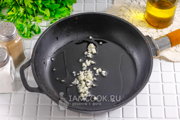 Очистите зубчик чеснока, мелко-мелко нарежьте или спрессуйте. Прогрейте на сковороде растительное масло и обжарьте в нем чесночную нарезку 1 минуту.