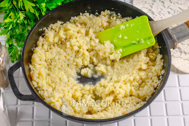 Всыпьте в емкость измельченную цветную капусту, поперчите всю массу и перемешайте. Убавьте нагрев до умеренного и томите, пока масса не начнет подрумяниваться.
