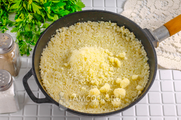 Выложите ложное ризотто из цветной капусты на тарелку и подайте к столу теплым, чтобы сыр тянулся.