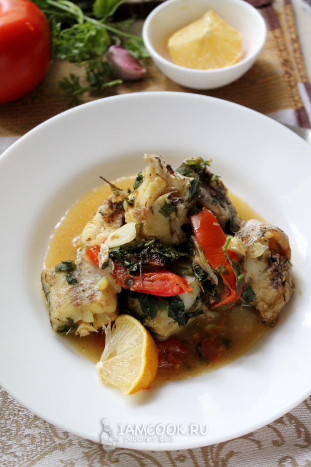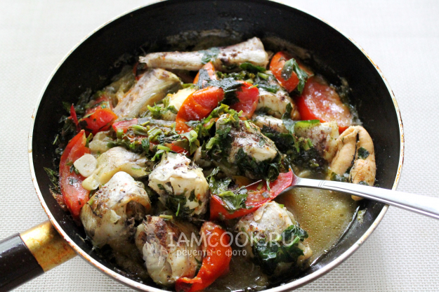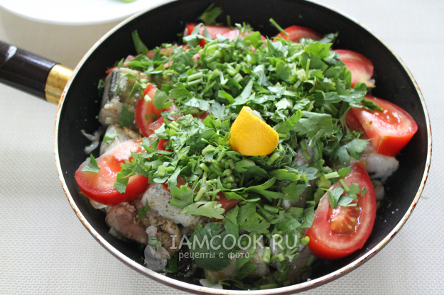 И прикрываем всё подготовленной зеленью, поливаем лимонным соком и тушим до готовности под крышкой.