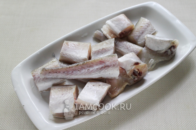Минтая очистите, хорошо промойте и разрежьте на порционные куски.