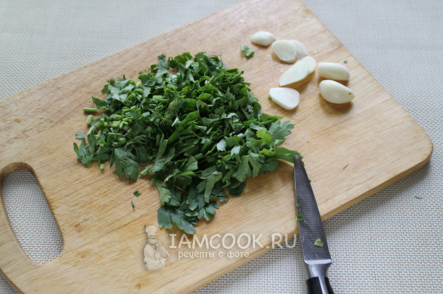 Мелко порубите зелень, лепестками порежьте несколько зубчиков чеснока.