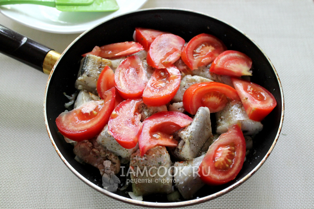 Рыбу можно присолить, поперчить и оставить на время, пока займемся овощами. Очистите крупную луковицу и порежьте ее четверть-кольцами. Помидоры нарежьте дольками.