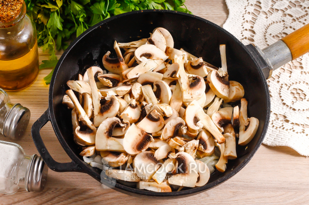 Нарежьте промытые грибы слайсами или ломтиками, добавьте к обжаренному луку. Не наоборот, иначе лук пропитается жидкостью, которую выделит грибная нарезка, и станет пропаренным! Обжарьте грибы с луком примерно 6-8 минут до румяности.