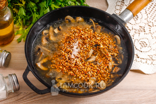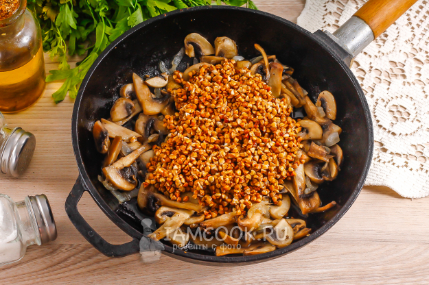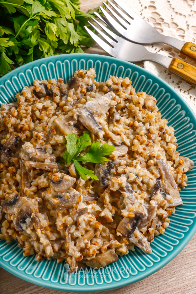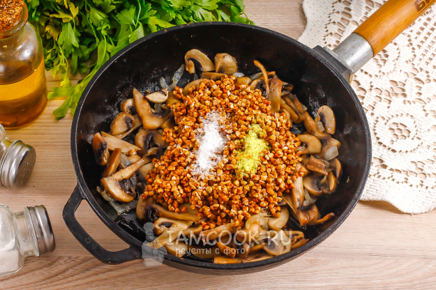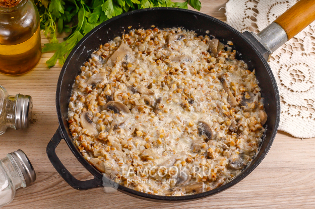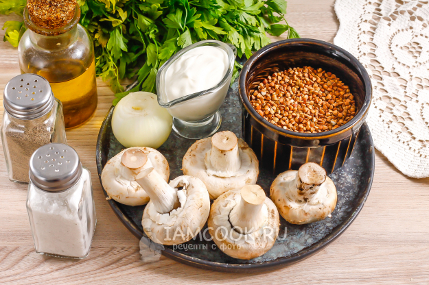 Возьмите необходимые ингредиенты для приготовления гречки с грибами и сметаной на сковороде.