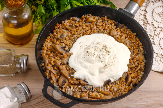 Спустя указанное время крупа набухнет и впитает в себя всю жидкость. Выложите в кашу сметану любой жирности и слегка поперчите. Аккуратно перемешайте.