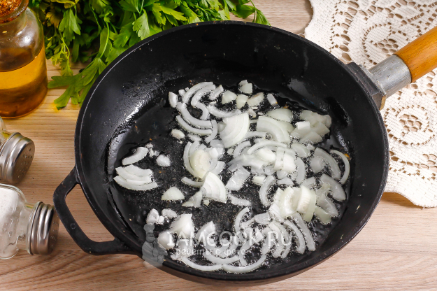 Очистите лук от кожуры и промойте в воде вместе с шампиньонами или вешенками. Лучше всего выбирать те грибы, которые можно найти в близлежащем магазине или супермаркете. Прогрейте растительное масло на сковороде с высокими бортиками. Нарежьте лук полукольцами и обжарьте примерно 3-4 минуты.