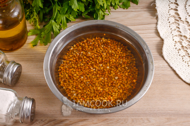 Крупу пересыпьте в глубокую емкость и промойте в воде, удалите подгоревшие зернышки.