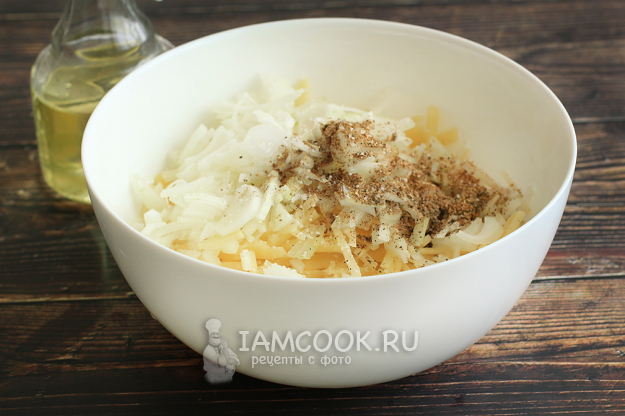 Соедините картофель, лук, соль, специи и влейте растительное масло. Хорошенько размешайте до однородности. Можно это делать руками.