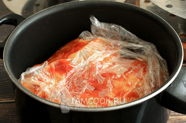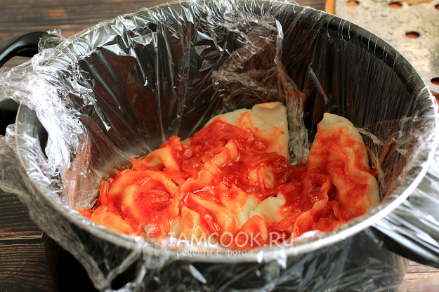 Возьмите удобную по размеру кастрюлю, выстелите ее пищевой пленкой с запасом. Выкладывайте слоями ханум и поливайте подливой каждое изделие, пока все не закончится.