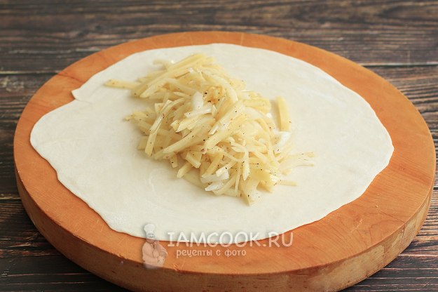 Каждый кусочек теста раскатайте очень тонко, до прозрачности, диаметром 18-20 см. Выложите начинку, как показано на фото.