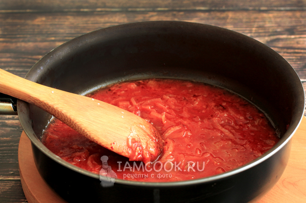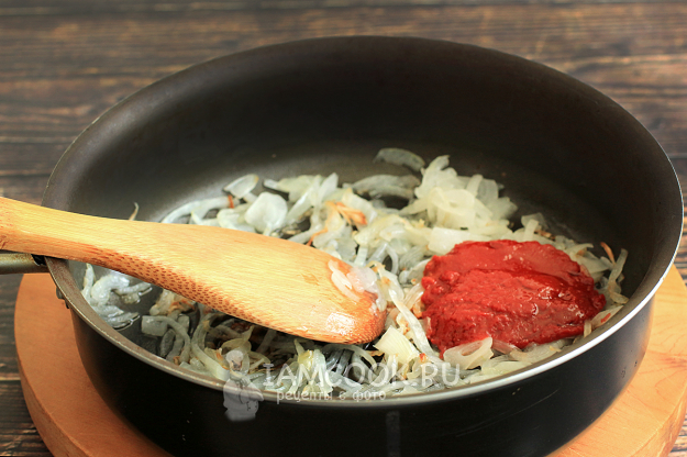 Добавьте томатную пасту и еще поджарьте все вместе 5 минут.