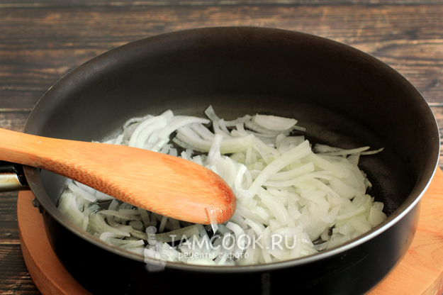 Тем временем приготовьте подливу. Обжарьте тонко нарезанный соломкой лук на растительном масле.