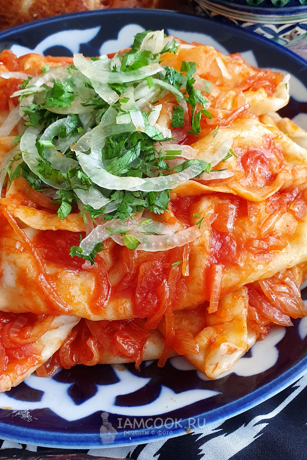 Для подачи тонко нарежьте репчатый лук и промойте его холодной водой. Соедините лук с зеленью и солью, посыпьте сверху готовое блюдо. Чорсу ханум можно подавать на стол! Ну очень вкусно!