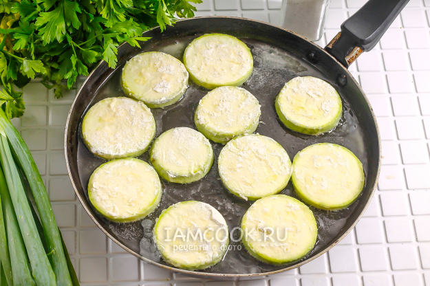 Кабачки и помидоры промойте в воде. Срежьте хвостики у кабачков, а из помидоров вырежьте сердцевинки. Нарежьте кабачки кольцами по 0,5-1 см толщиной и посолите нарезку. Оставьте на 5-10 минут, чтобы она выделила сок. Затем промокните бумажными салфетками. Прогрейте на сковороде растительное масло и обмакните каждый кружочек кабачка в муку с обеих сторон.