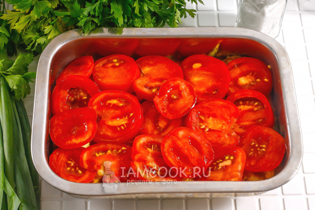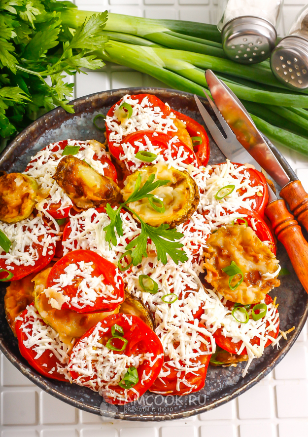 Нарежьте помидоры кружочками и выложите на кабачки. Если хотите добавить немного лука или чеснока, то очистите их, мелко нарежьте и выложите сначала на кабачки лук или чеснок, а на них - помидорную нарезку.