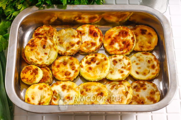 Выложите обжаренные кабачки в форму для запекания. Они будут являться основой блюда. Присыпьте овощной приправой для усиления вкуса блюда.