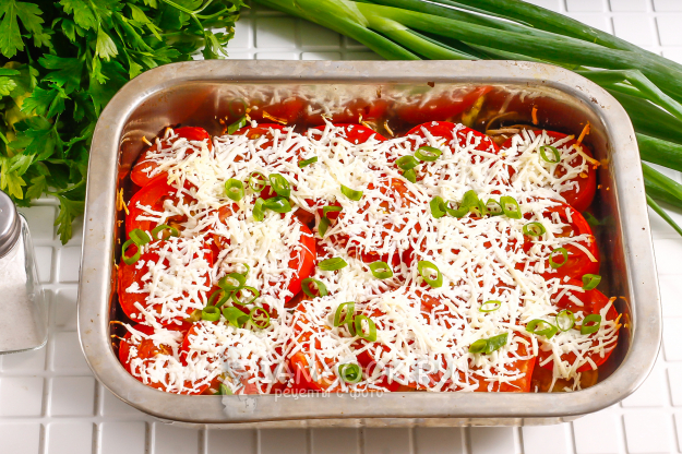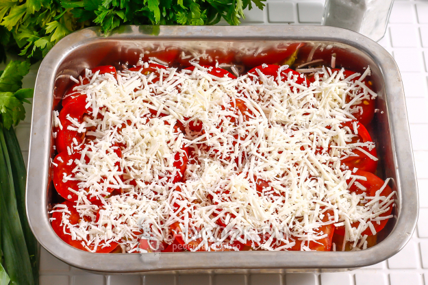 Натрите брынзу на треке с мелкими или крупными ячейками. Разогрейте духовку до 180-200 градусов и запеките блюдо примерно 10-20 минут до расплавления брынзы сверху. Время приготовления полностью зависит от мощности техники. Главное - расплавить сыр. Кстати, помидоры не солите, так как брынза итак соленая.