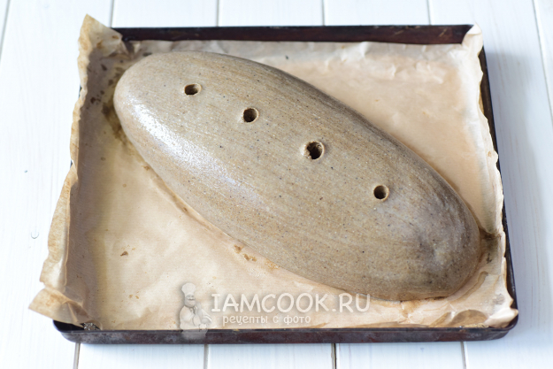 Очень аккуратно перенесем сформованный батон-заготовку на противень, застеленный пергаментом для выпечки. В таком положении оставим сформованное тесто на расстойку на 2 часа в комнатных условиях, накрывать не надо. В течение этих двух часов два раза через равные промежутки времени оглаживаем батон увлажненными руками, корректируя изначальную форму (тесто может немного расплыться).