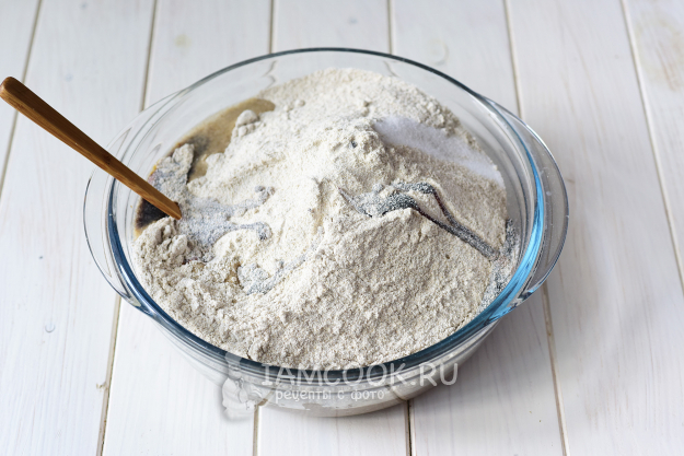 Займемся сразу же и заваркой. С вечера в просторную миску выложим муку, солод, кориандр. Перемешаем до соединения всех ингредиентов.