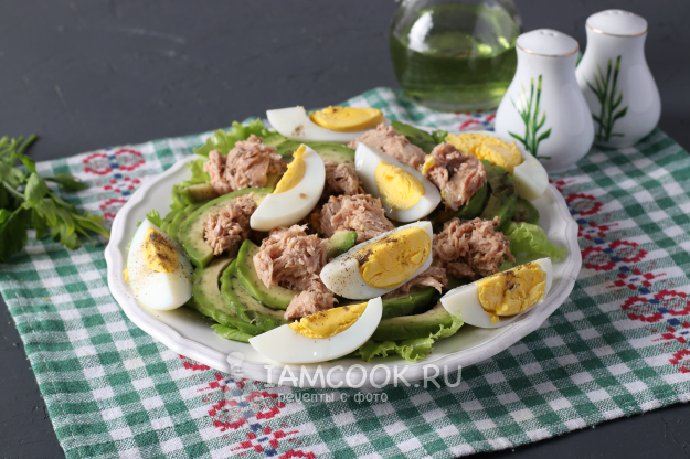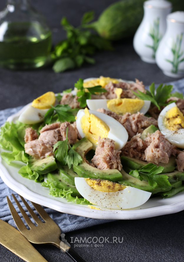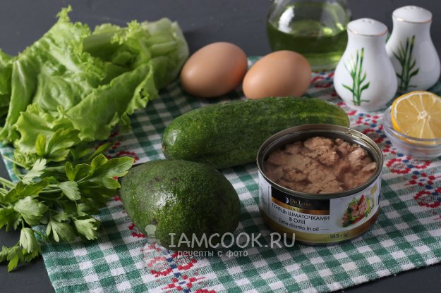 Для приготовления салата с тунцом, авокадо, яйцом и огурцом подготовить из списка необходимые ингредиенты. Яйца сразу нужно сварить до готовности в течение 10 минут.