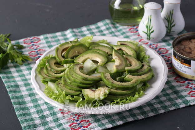 Затем выложить ломтики авокадо вместе с лимонным соком.