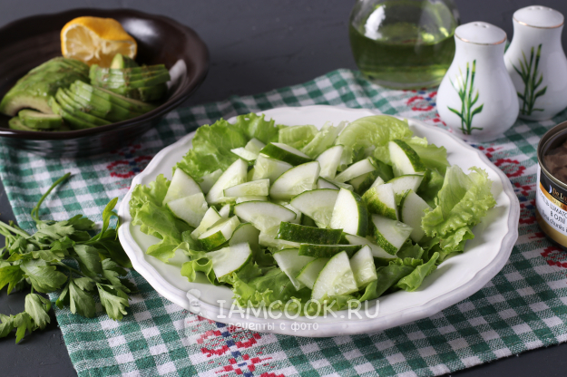 Промыть и обсушить салатные листья, порвать их руками на тарелку. Ломтиками нарезать огурец и выложить его сверху на салатные листья, посолить.