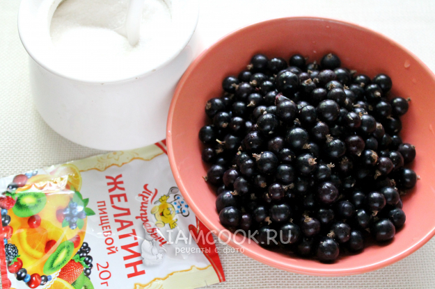 Возьмите продукты для приготовления джема из черной смородины с желатином.