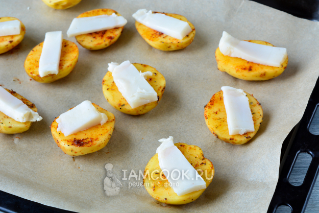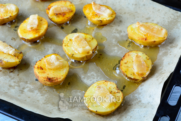 На противень выложите картофель и сверху на нем распределите по кусочку сала. Противень я застелила пергаментом. Также подходит и фольга.