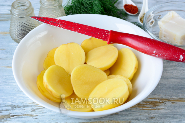 Затем разрежьте картофель на половинки. Овощи у меня небольшие. Если картофель крупный, то нарежьте его средними пластинками.