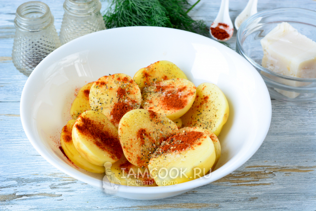 Картофель присыпьте специями, чуть посолите и поперчите, хорошо перемешайте. Если сало у вас соленое, то с солью будьте осторожны. Со специями можете экспериментировать. Я люблю паприку и прованские травы.