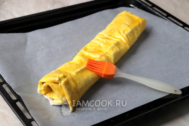 Выложите его на противень, застеленный пергаментом, и смажьте взбитым яйцом.
