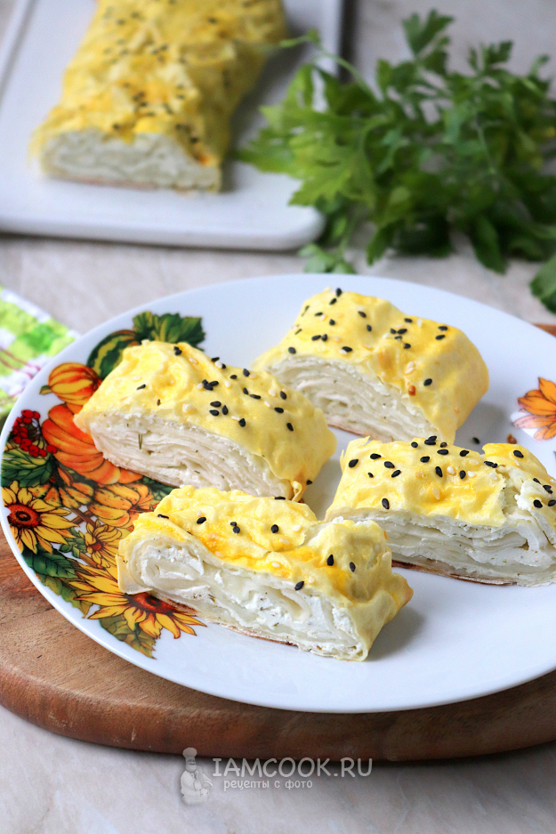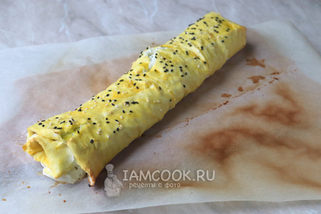 Выпекайте ПП штрудель из лаваша с творогом в предварительно прогретой духовке около 20 минут при 180 градусах.